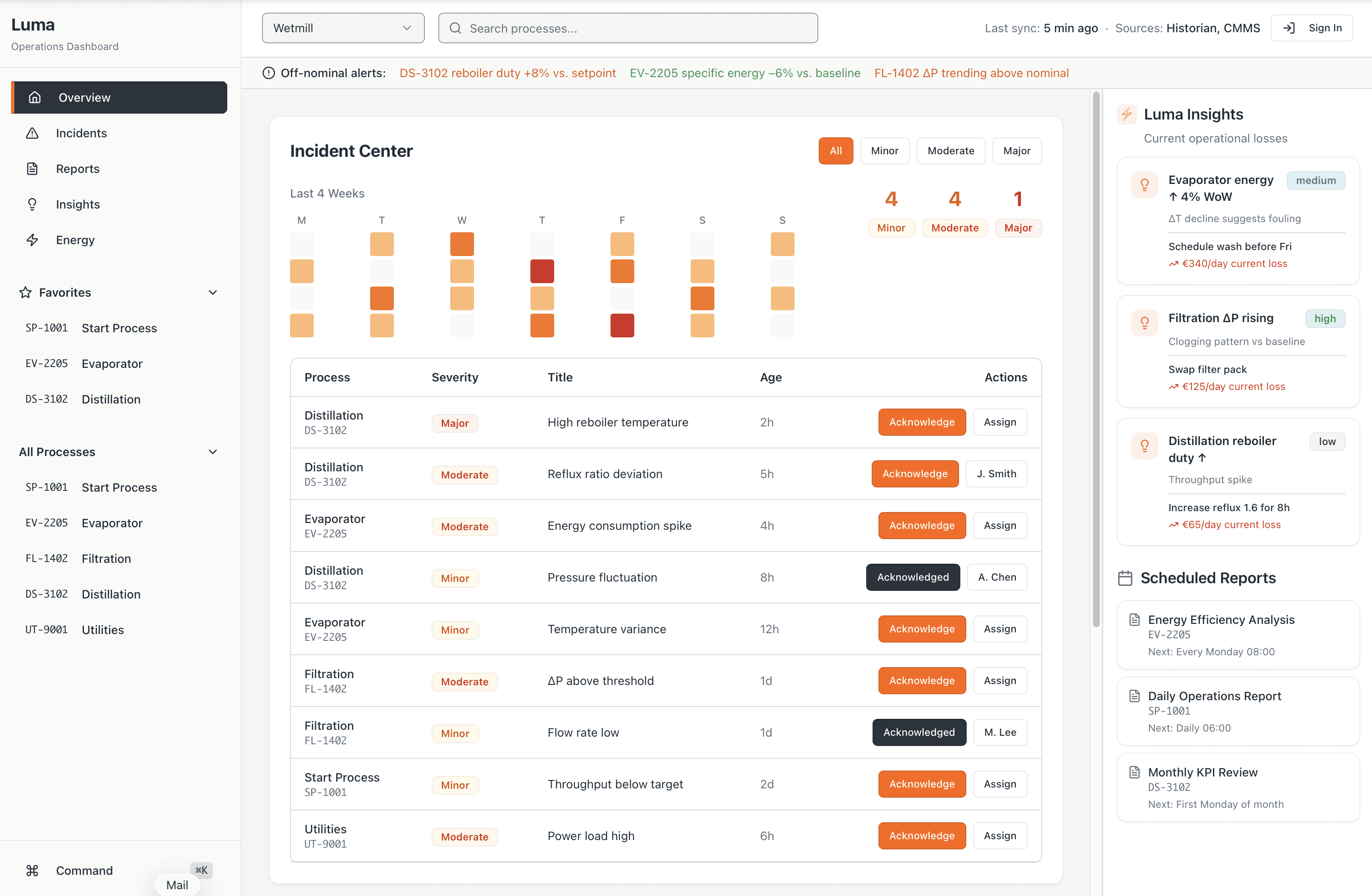 Luma intelligently connects process, equipment, and energy data to discover your plant’s real performance baselines, catch subtle drifts before they escalate, predict time-to-limit events, and highlight savings opportunities with prioritized actions. Your operations remain fully under your team’s control with deeper, earlier visibility.